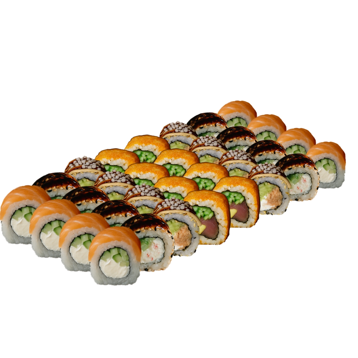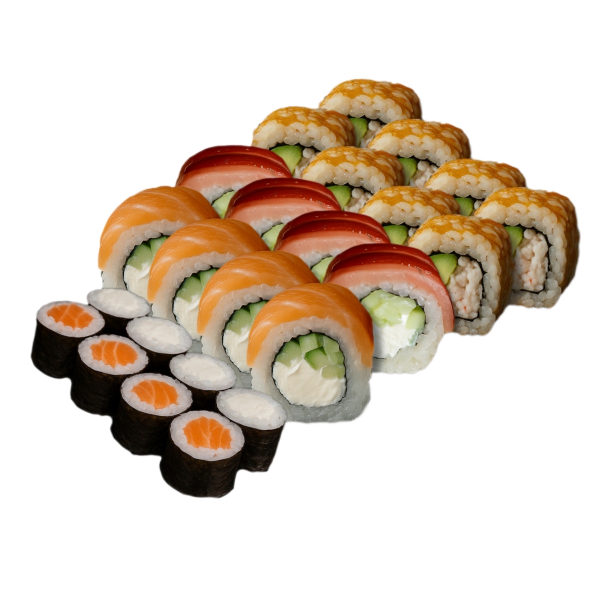 Каліфорнії в ікрі з лососем(4шт), з вугрем(4 шт), з тунцем (4шт), з міксом краба( 4 шт), Філадельфії з лососем (4шт), з вугрем (4шт), з тунцем( 4шт), з креветками(4шт), макі з огірком, макі з міксом сніжного краба та огірком, макі з тунцем, макі з лососем.+ 3 набори