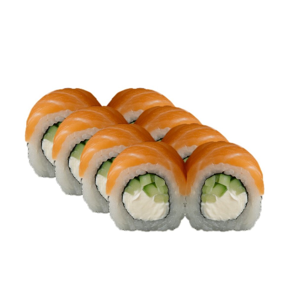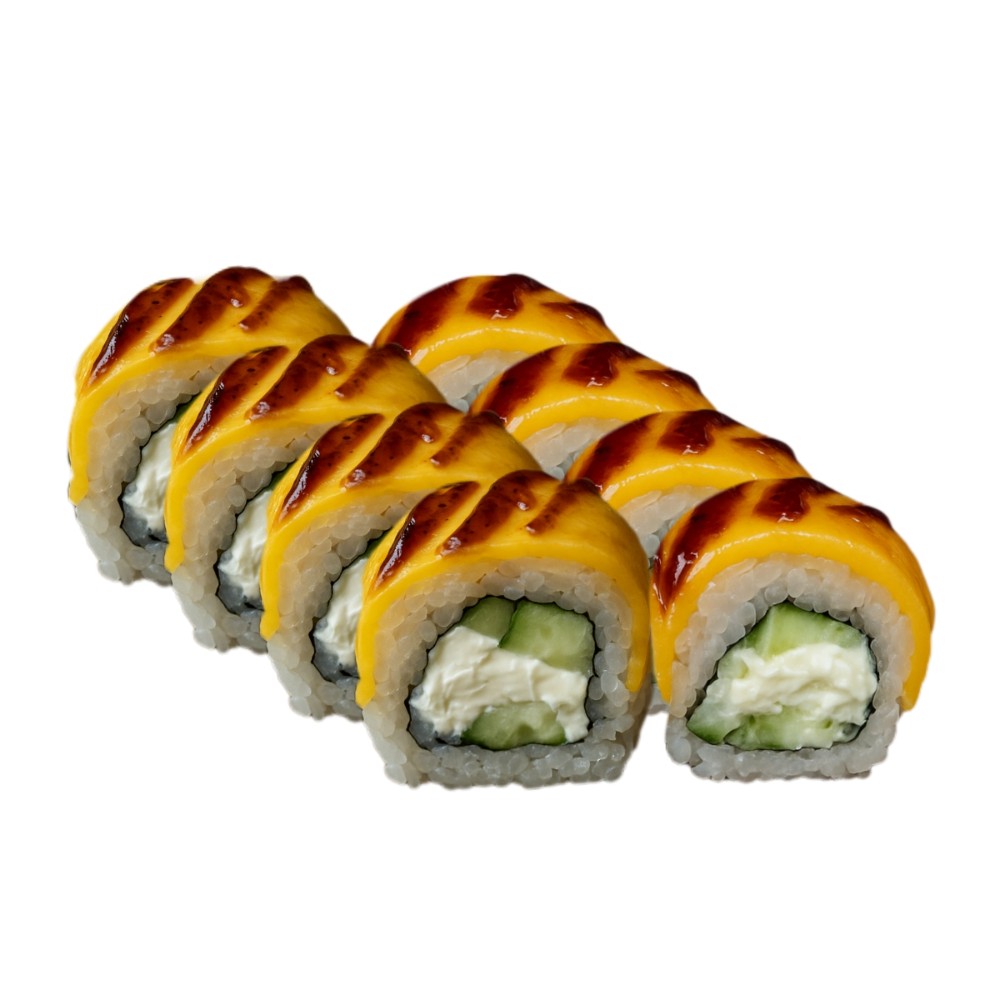 Свіжий лосось, ікра масаго, рис, норі, огірок, крем сир, запечена сирна шапочка ( моцарела, японський майонез, крем сир)