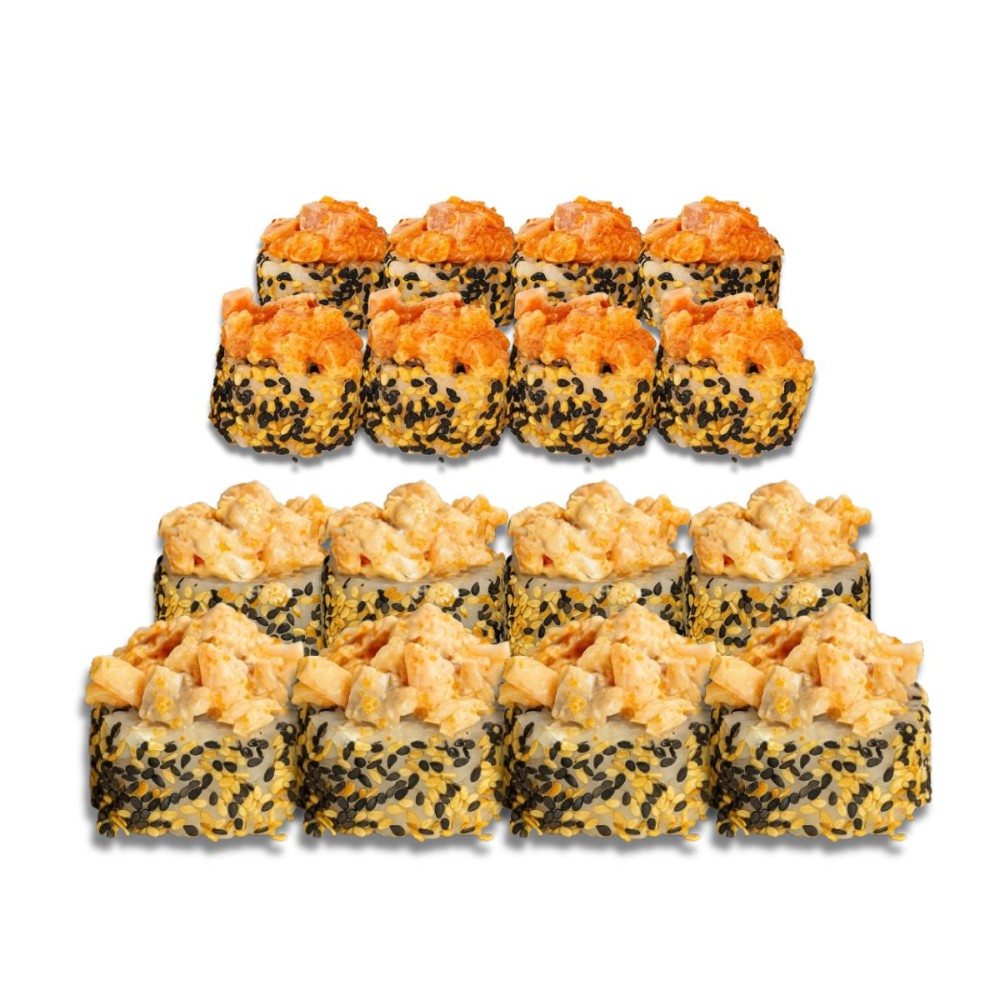 Теплий в кунжуті з тунцем, Теплий в ікрі з лососем, Теплий фьюжин , Теплий макі з лососем гриль + 2 набори