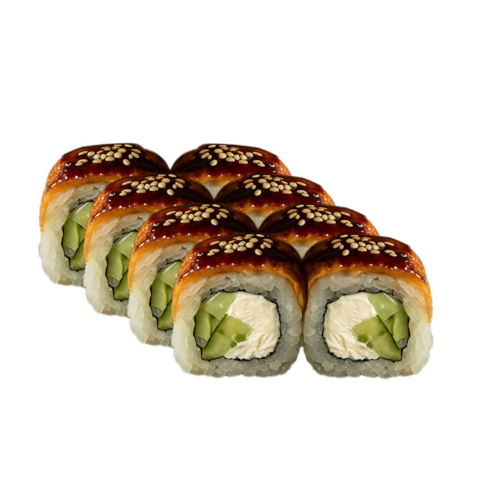 Вугор, крем-сир, авокадо, огірок, унагі соус, кунжут, рис, норі,