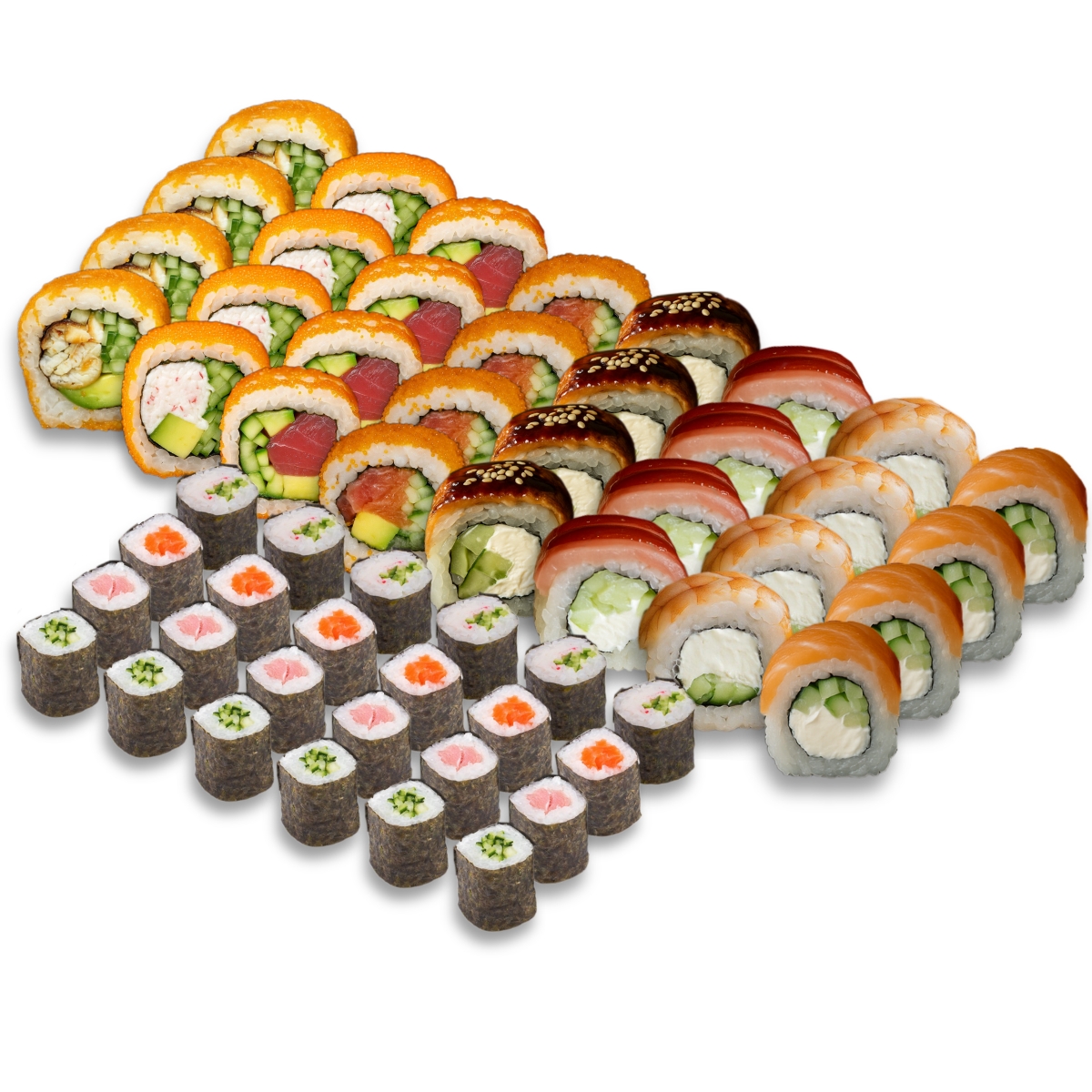 Каліфорнія в ікрі з тунцем, Рол краб-унагі, Каліфорнія делюкс з креветками, Філадельфія з лососем та огірком. 800 г + 2 комплекти