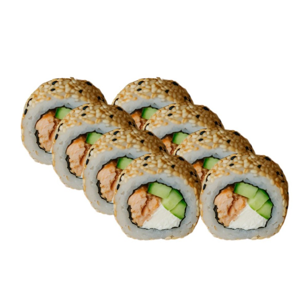 Запечена сирна шапочка з спайсі тартаром ( креветки, моцарела, японський майонез, соус Шрірача, сік лайма), огірок, крем сир, авокадо, кунжут, рис, норі.