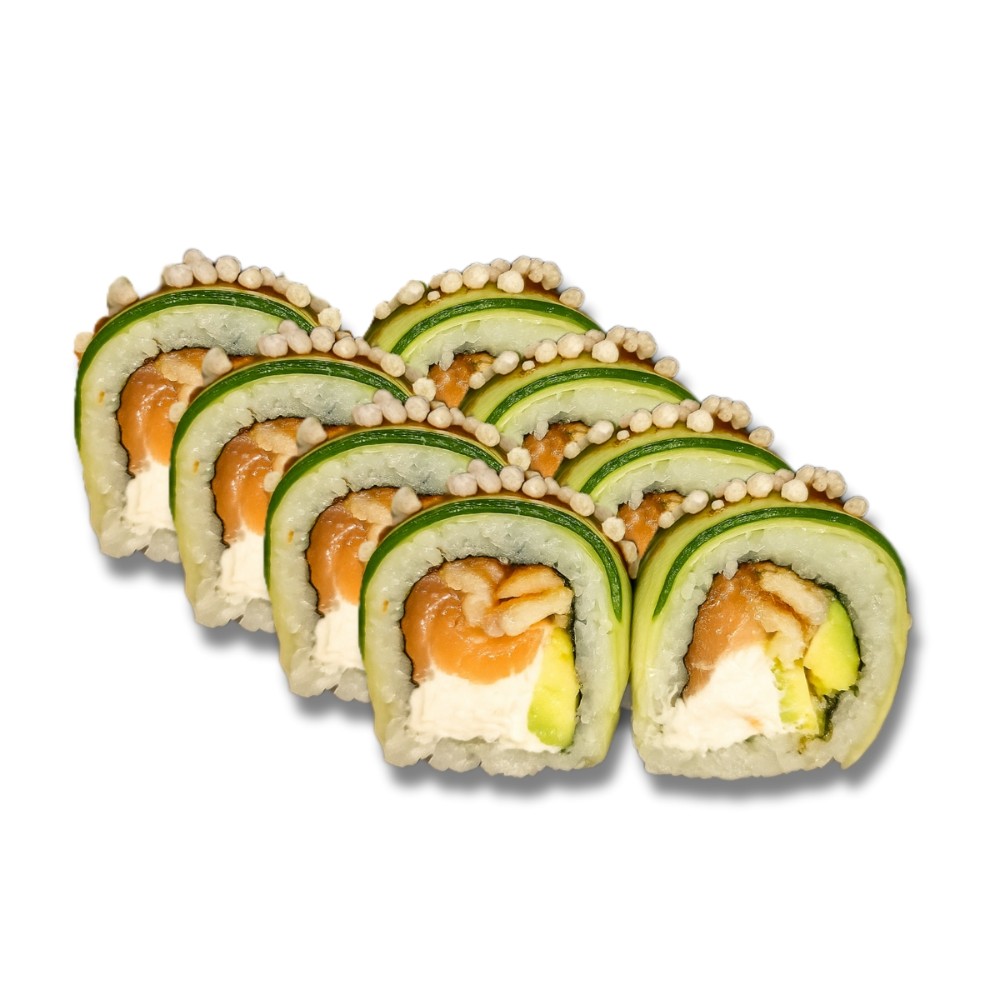 Рис, норі, лосось, ікра масаго, спайсі соус, огірок, крем-сир, соус унагі.