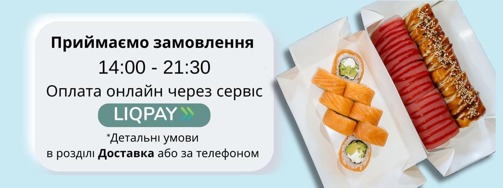 Вага: 840г + 100г ( 2 соєвих, 2 імбиря, 2 васабі, 2 палочки)